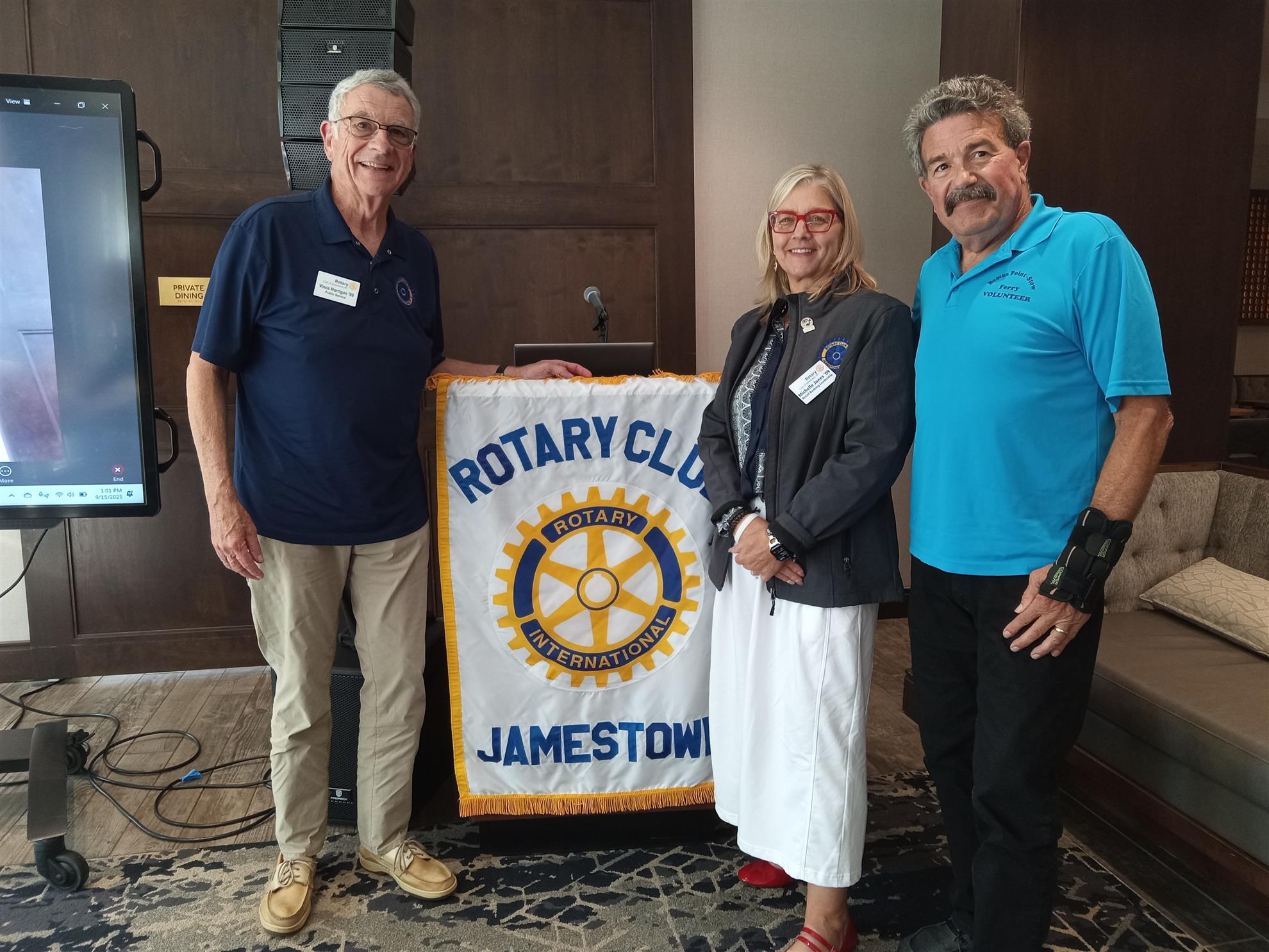 The day's guest speaker was Jay Kuntz, co-president of the Bemus-Stow Ferry and who was introduced by Vince Horrigan. Jay is from Pittsburgh, but has strong ties to Chautauqua Lake and the Stow community, with his grandparents having honeymooned on the lake in 1917. Jay is a life-long visitor and since retirement, spends May through October living here. Jay is a 1977 graduate of Kent State University. Prior to retirement, Jay worked as an independent/freelancer in both video and television - coordinating the crews and equipment needed to create footage for both cable and network stations. He also worked instant replay for live sporting events. Upon retirement in 2016, Jay became involved with the Ferry because he wanted to spend more time looking across the narrows.