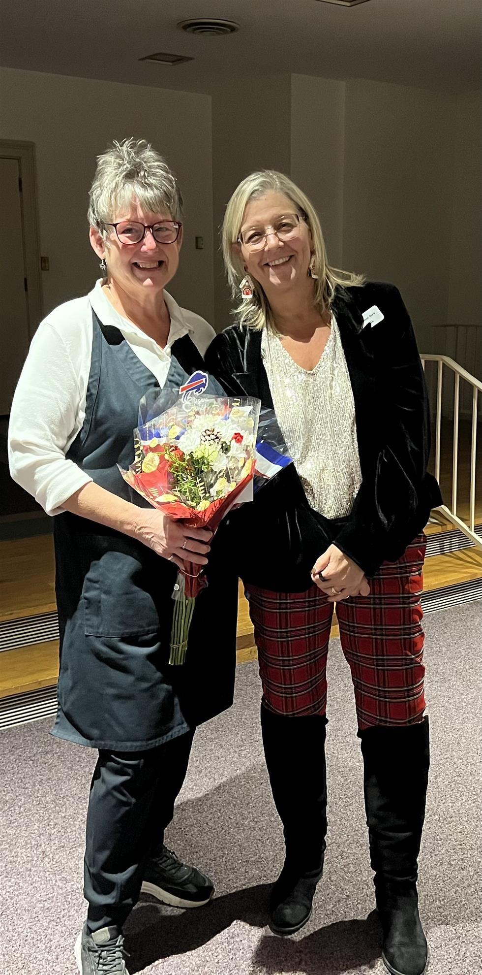 Michelle invited our dear former Rotarian Vicki McGraw to the front of the room and congratulated her on her impending retirement after 35 years of catering very special events for our community, presenting her with a lovely bouquet of red, white and blue Buffalo Bills-themed flowers.